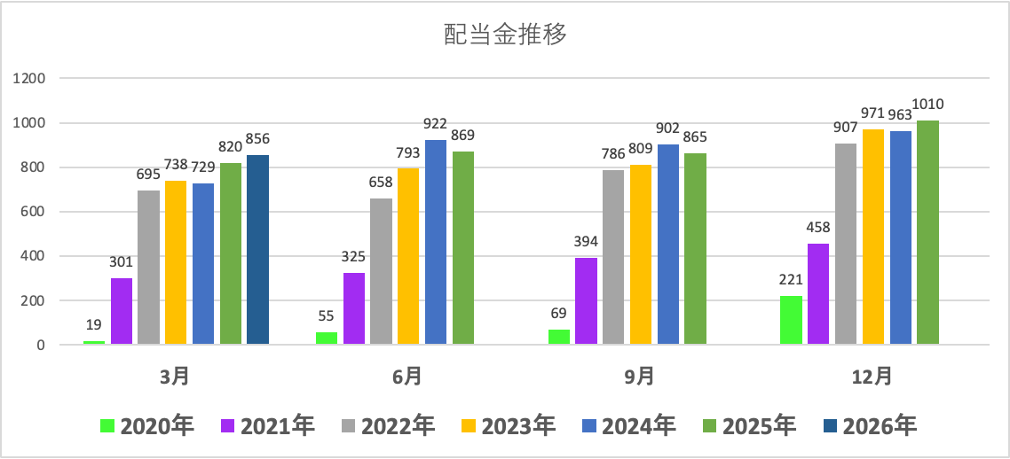 上の棒グラフは各年における4半期毎の配当金推移です。